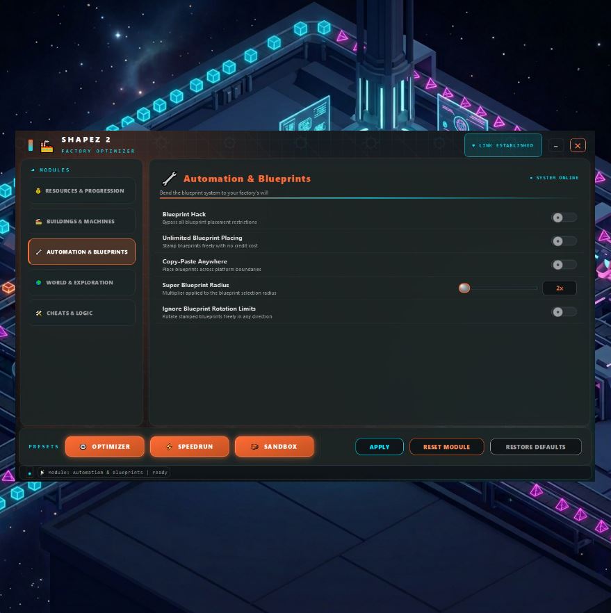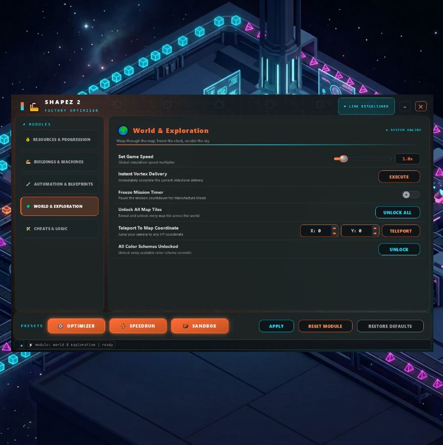 Unlimited research, machine speed x20, blueprint hack, game speed control, teleport โ 30 features, three presets for total factory domination.